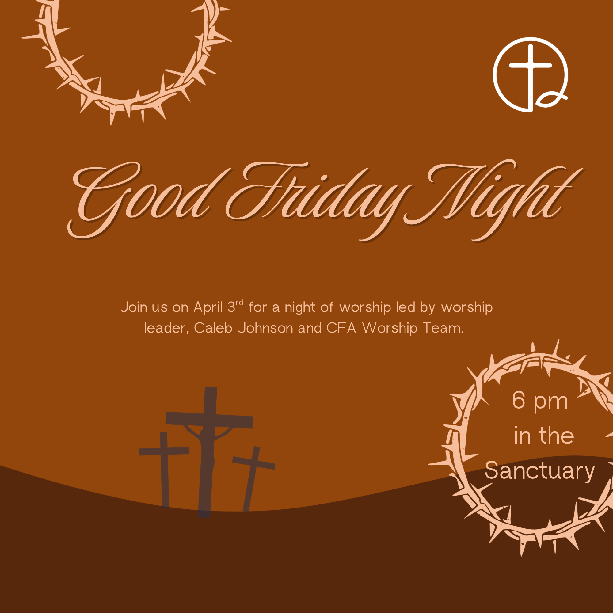 Join us on April 3rd for a night of worship led by worship leader, Caleb Johnson and CFA worship team. Good Friday worship night will begin at 6 PM in the sanctuary. Check out our Facebook page for more information and updates.