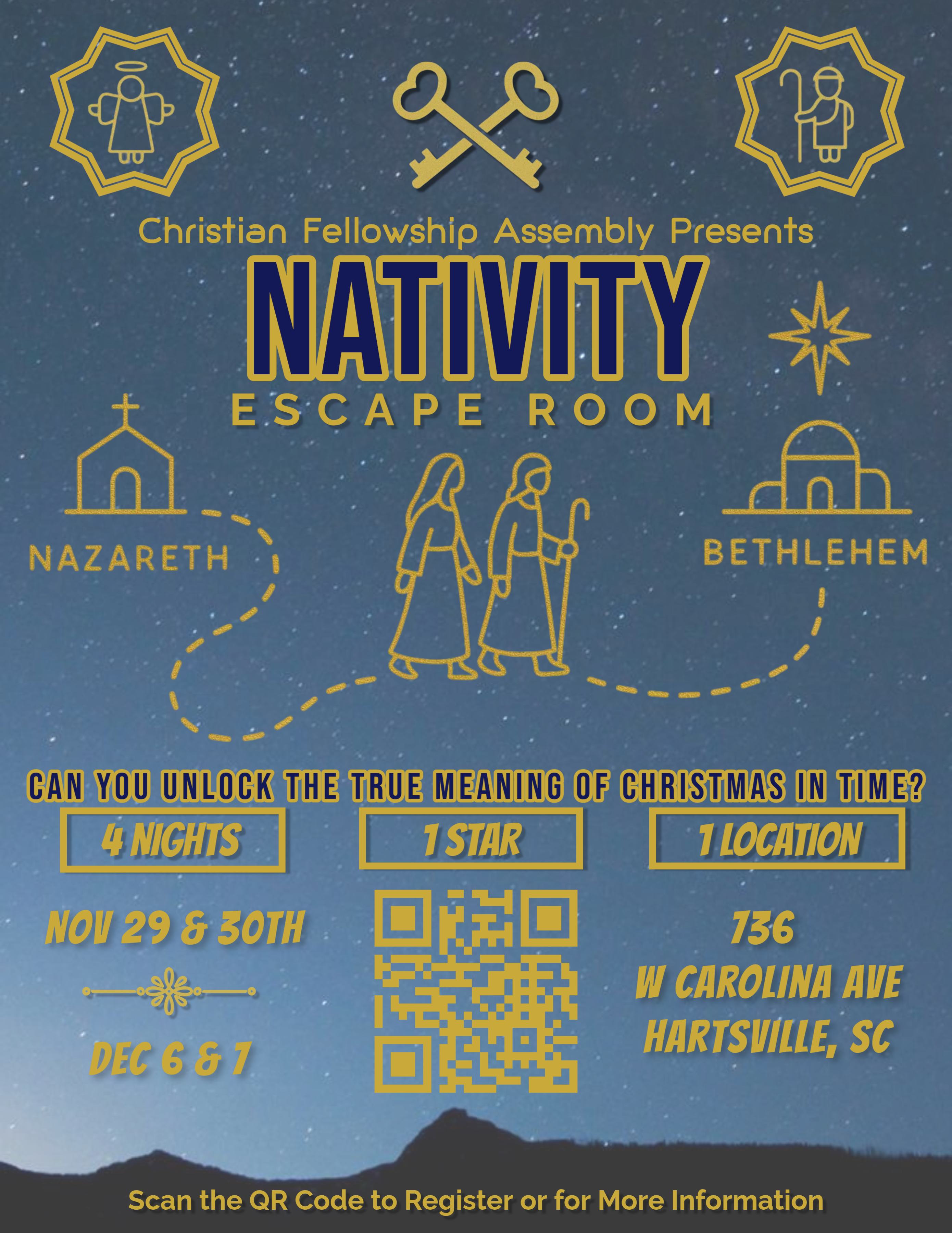 Thank you for visiting our site to learn more about this Christ-centered, family-friendly community event! We invite you to step into an immersive experience where you will “Unlock the True Meaning of Christmas.”