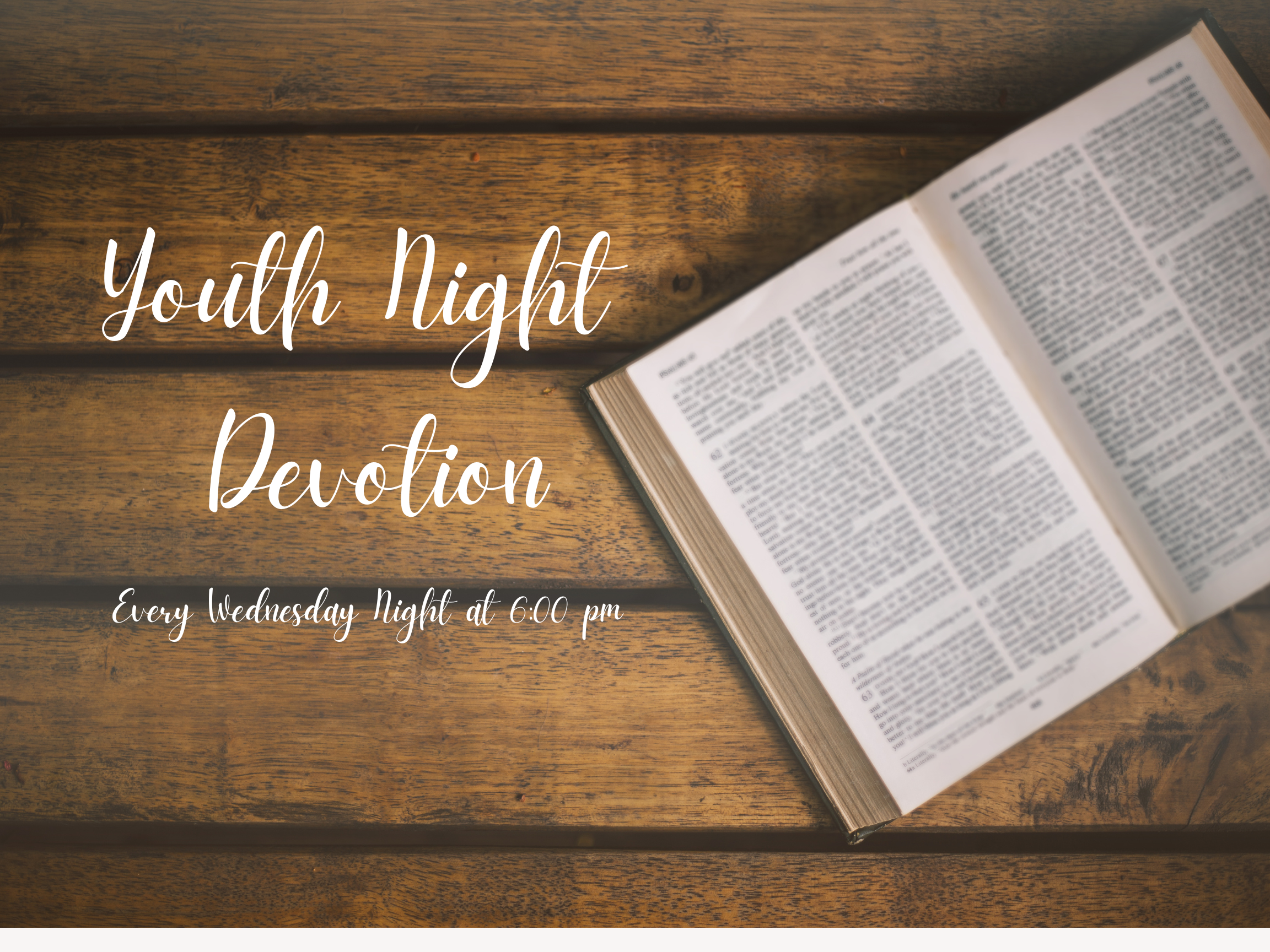 Join us every Wednesday at 6 PM for a Youth Night Devotion. If you want to connect with the Lord and with others your age, join us! We can't wait to meet you. Let us know you're coming by clicking below!